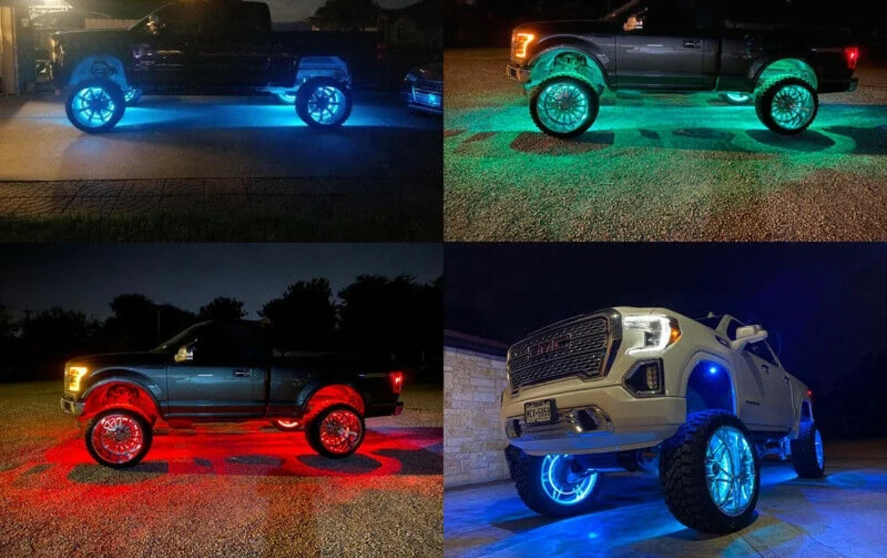 Our Quad Row RGB Dream Chasing Wheel Lights come with a Bluetooth / Remote Controlled option! These wheel lights are guaranteed to light up the entire underbody of your truck. Pairs great with Frame mounted Rock lights to turn your vehicle into a spaceship!